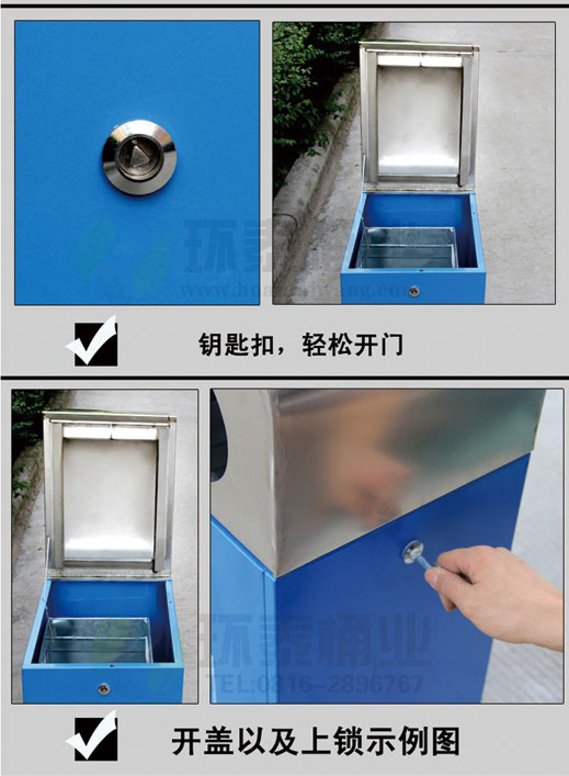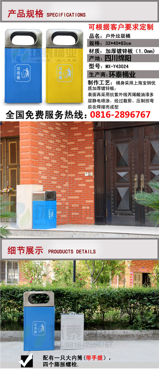 不銹鋼垃圾桶HT-BXG7840,該產(chǎn)品整體采用優(yōu)質(zhì)的鍍鋅鋼板生產(chǎn)加工而成,產(chǎn)品顏色為:黃色,規(guī)格為長320mm寬400mm高830mm,本款戶外雙面投扣不銹鋼垃圾桶整體采用優(yōu)質(zhì)鍍鋅板,經(jīng)折彎沖壓一次性成型.產(chǎn)品一律用室外粉靜電噴塑,經(jīng)過180°的高溫,限度延長了垃圾桶的使用壽命,使垃圾桶顏色持久不變,亮麗如新.表面經(jīng)除油——清洗——酸洗——清洗——表調(diào)——磷化——清洗——烘干——靜電粉末噴涂——高溫塑化——冷卻.噴涂粉末經(jīng)ISO9002質(zhì)量體系認證,易保潔表面光滑之優(yōu)點,不脫落,不起層。,HT-BXG7840不銹鋼垃圾桶也可按照您的具體需求可定制尺寸和顏色,可印制LOGO及文字,詳見說明或咨詢客服.環(huán)泰愿為環(huán)保護航,一切為您,放心采購