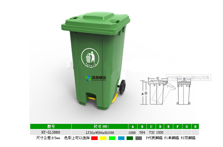 塑料垃圾桶HT-SL3860該產(chǎn)品整體采用優(yōu)質(zhì)的高密度聚乙烯(HDPE)生產(chǎn)加工而成,產(chǎn)品顏色為:綠色,規(guī)格為長732mm寬584mm高1088mm,本款戶外腳踏240L塑料垃圾桶采用工程塑料制造,100%的高密度聚乙烯或者是聚丙烯為原材料經(jīng)過嚴(yán)格的科學(xué)的注模工藝精制而成.針對目前市場上使用的產(chǎn)品情況和經(jīng)常出現(xiàn)的問題在塑料垃圾桶底部上沿口都做了加強(qiáng)處理,在桶身的壁厚上采用非等厚設(shè)計(jì)原理,把薄弱環(huán)節(jié)加厚,所用輪子采用高承載力耐磨靜音輪,使用壽命超長,HT-SL3860塑料垃圾桶也可按照您的具體需求僅定制顏色,可印制LOGO及文字