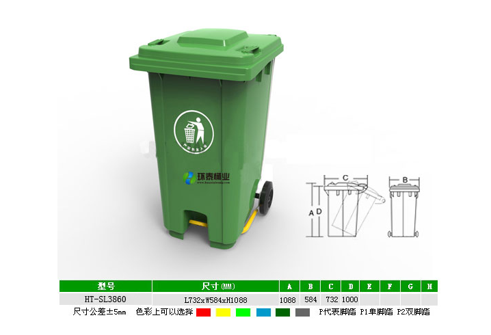 塑料垃圾桶HT-SL3860該產(chǎn)品整體采用優(yōu)質(zhì)的高密度聚乙烯(HDPE)生產(chǎn)加工而成,產(chǎn)品顏色為:綠色,規(guī)格為長(zhǎng)732mm寬584mm高1088mm,本款戶外腳踏240L塑料垃圾桶采用工程塑料制造,100%的高密度聚乙烯或者是聚丙烯為原材料經(jīng)過嚴(yán)格的科學(xué)的注模工藝精制而成.針對(duì)目前市場(chǎng)上使用的產(chǎn)品情況和經(jīng)常出現(xiàn)的問題在塑料垃圾桶底部上沿口都做了加強(qiáng)處理,在桶身的壁厚上采用非等厚設(shè)計(jì)原理,把薄弱環(huán)節(jié)加厚,所用輪子采用高承載力耐磨靜音輪,使用壽命超長(zhǎng)