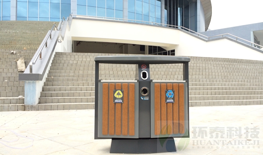 全新的德瀾仕分類鋼木垃圾桶HT-WDF5555安裝在科學(xué)城公園內(nèi)