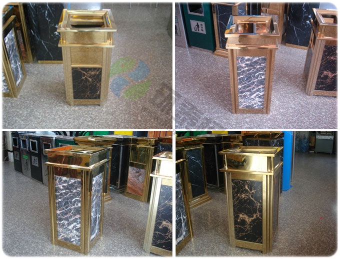 鈦金垃圾桶HT-SN001,該產(chǎn)品整體采用優(yōu)質(zhì)的不銹鋼鋼板生產(chǎn)加工而成,產(chǎn)品顏色為:鈦金色,規(guī)格為長300mm寬300mm高685mm,本款扁水晶座機室內(nèi)垃圾桶采用天然的大理石與優(yōu)質(zhì)冷軋鋼板或不銹鋼鋼板制作而成,四面大理石用鋼板螺絲固定于桶體,有內(nèi)桶,方便提倒垃圾,桶頭煙灰盅可放白石子,石子可清洗.鋼板經(jīng)折彎沖壓一次性成型.產(chǎn)品一律用室外粉靜電噴塑,經(jīng)過180°的高溫,限度延長了垃圾桶的使用壽命,使垃圾桶顏色持久不變,亮麗如新.表面經(jīng)除油——清洗——酸洗——清洗——表調(diào)——磷化——清洗——烘干——靜電粉末噴涂——高溫塑化——冷卻.噴涂粉末經(jīng)ISO9002質(zhì)量體系認證,產(chǎn)品易保潔表面光滑之優(yōu)點,不脫落,不起層,HT-SN001鈦金垃圾桶也可按照您的具體需求可定制尺寸和顏色,可印制LOGO及文字,詳見說明或咨詢客服.環(huán)泰愿為環(huán)保護航,一切為您,放心采購。