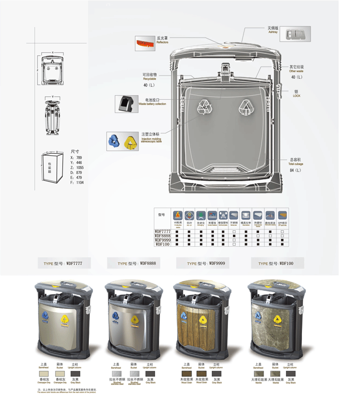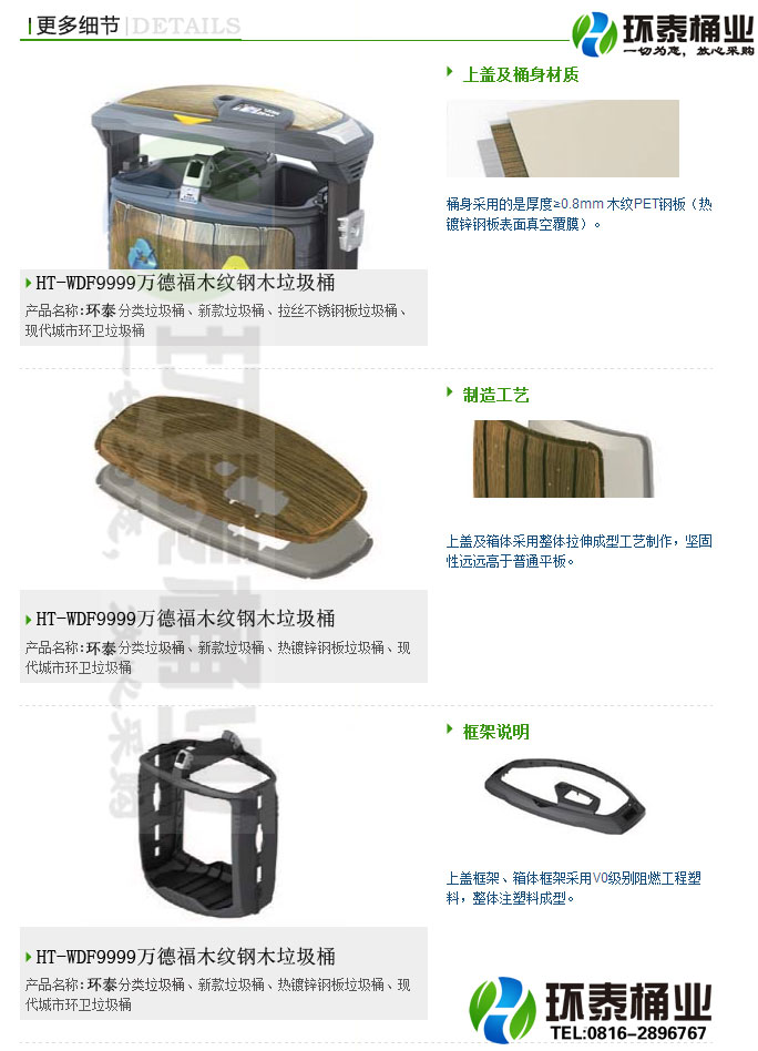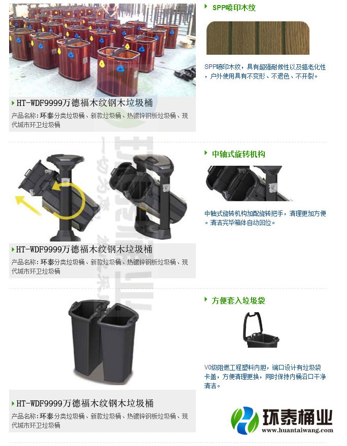 德瀾仕垃圾桶HT-WDF9999,該產(chǎn)品整體采用優(yōu)質(zhì)的電解溶鍍鋅板生產(chǎn)加工而成,產(chǎn)品顏色為:深灰+木紋色,規(guī)格為長(zhǎng)1104mm寬528高1047mm,本款萬(wàn)德福木紋鋼木垃圾桶特點(diǎn):具有VO阻燃、抗UV紫外線、防老化、耐腐蝕、增強(qiáng)塑料、整體模具拉伸、熱鍍鋅板、靜電噴涂、SPP噴印,生產(chǎn)工藝采用?,HT-WDF9999德瀾仕垃圾桶也可按照您的具體需求僅定制顏色,可印制LOGO及文字,詳見(jiàn)說(shuō)明或咨詢客服.環(huán)泰愿為環(huán)保護(hù)航,一切為您,放心采購(gòu)。