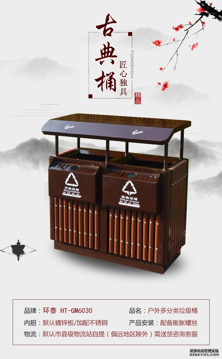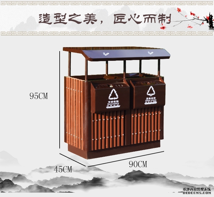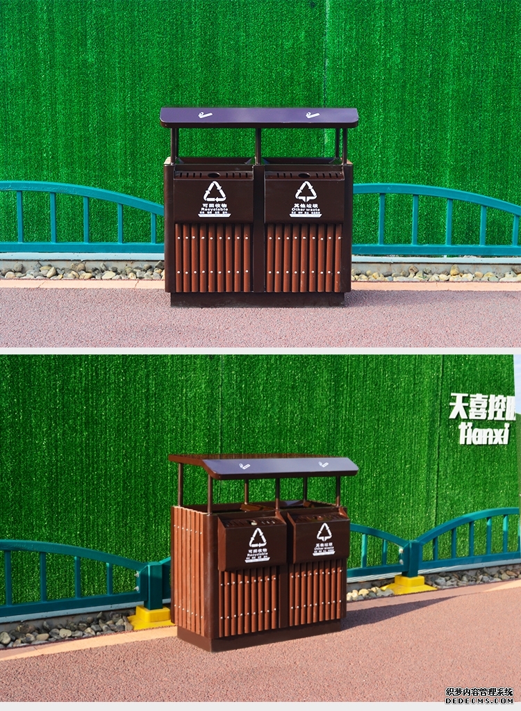 鋼木垃圾桶HT-GM6030,該產(chǎn)品整體采用優(yōu)質(zhì)的冷軋鋼板,鍍鋅鋼板,防腐木生產(chǎn)加工而成,產(chǎn)品顏色為:咖啡色,規(guī)格為長(zhǎng)950mm寬450mm高900mm,本款景區(qū)古典兩分類(lèi)鋼木金箍棒桶制造工藝采用:1、鋼木垃圾桶桶身采用優(yōu)質(zhì)進(jìn)口防腐木、進(jìn)口山樟木或水曲柳制作,先經(jīng)過(guò)烘干脫水、壓刨、打磨、倒角、防腐處理后表面噴涂進(jìn)口抗紫外線(xiàn)聚脂漆等工序,再經(jīng)高溫噴塑處理,可抑制微生物的寄生、繁殖與蛀蝕,具有防水、防霉等保護(hù)功效,能夠抑制霉菌和藻類(lèi)生物的生長(zhǎng),可有效減少紫外線(xiàn)導(dǎo)致的褪色,延長(zhǎng)木材在戶(hù)外環(huán)境中的使用壽命.客戶(hù)也可以采用塑木代替實(shí)木.2、鋼木垃圾箱采用鍍鋅鋼板材質(zhì)制作,鋼結(jié)構(gòu)均經(jīng)過(guò)酸洗、磷化表面處理,然后再使用高溫噴塑工藝,使垃圾桶更加經(jīng)久耐用,防腐、防銹,美觀(guān)大方.3、鋼木果皮箱采用內(nèi)部膨脹螺栓固定的方式,不易推到,不易被偷盜,使垃圾桶更加安全牢實(shí).隱形固定還可以防止撞傷行人.