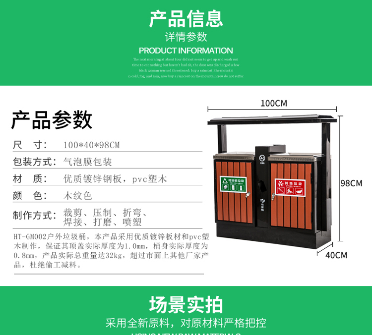 產(chǎn)品材質(zhì):鍍鋅鋼板,塑木,可回收環(huán)保材料