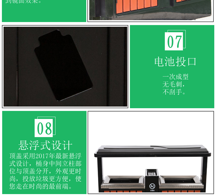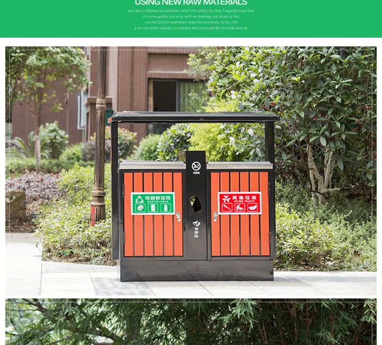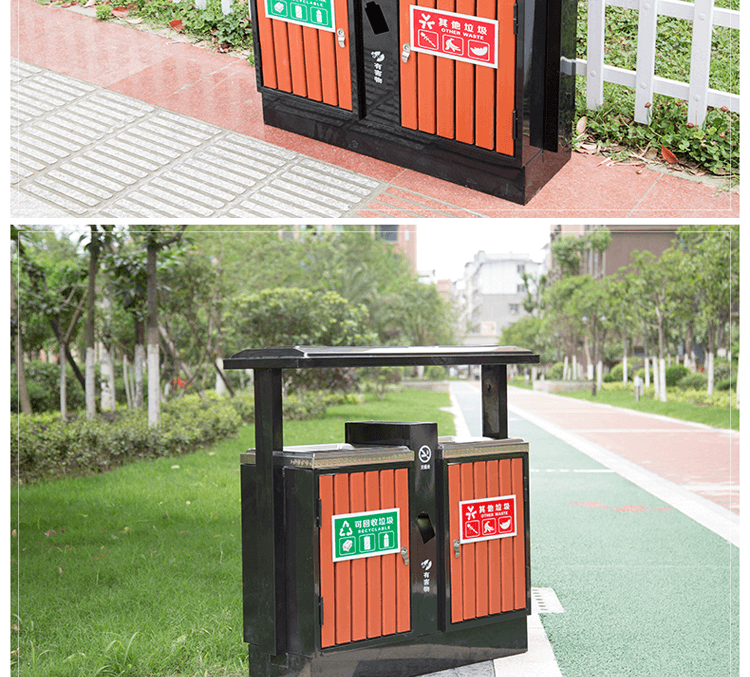 鋼木垃圾桶HT-GM002,該產(chǎn)品整體采用優(yōu)質(zhì)的鍍鋅鋼板,塑木,可回收環(huán)保材料生產(chǎn)加工而成,產(chǎn)品顏色為:黑灰色,原木色,規(guī)格為1000*400*980mm,本款塑木分類垃圾桶,HT-GM002鋼木垃圾桶也可按照您的具體需求可定制尺寸和顏色,可印制LOGO及文字,詳見說明或咨詢客服.環(huán)泰愿為環(huán)保護(hù)航,一切為您,放心采購。