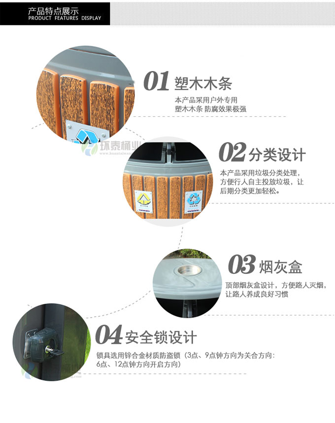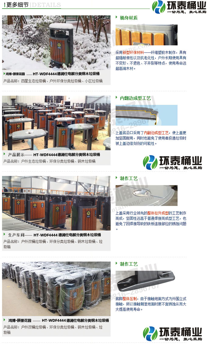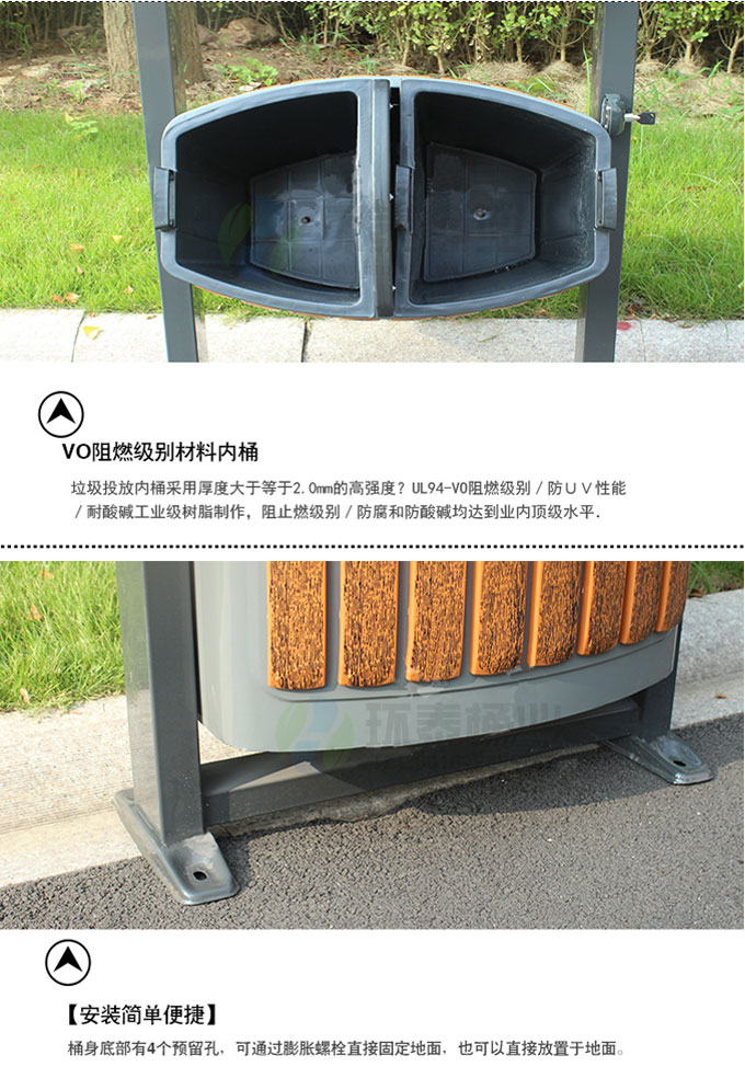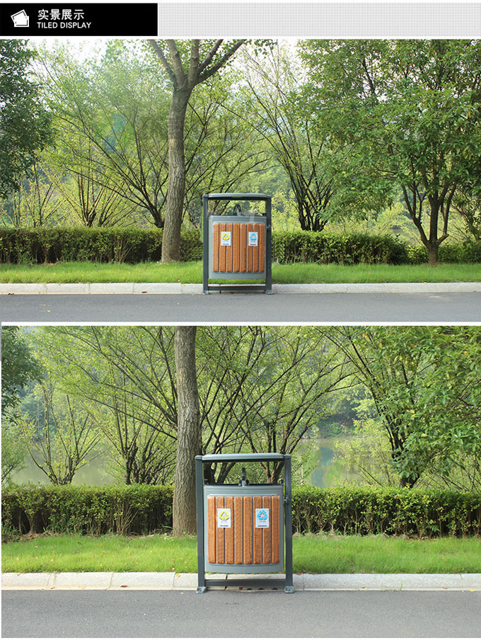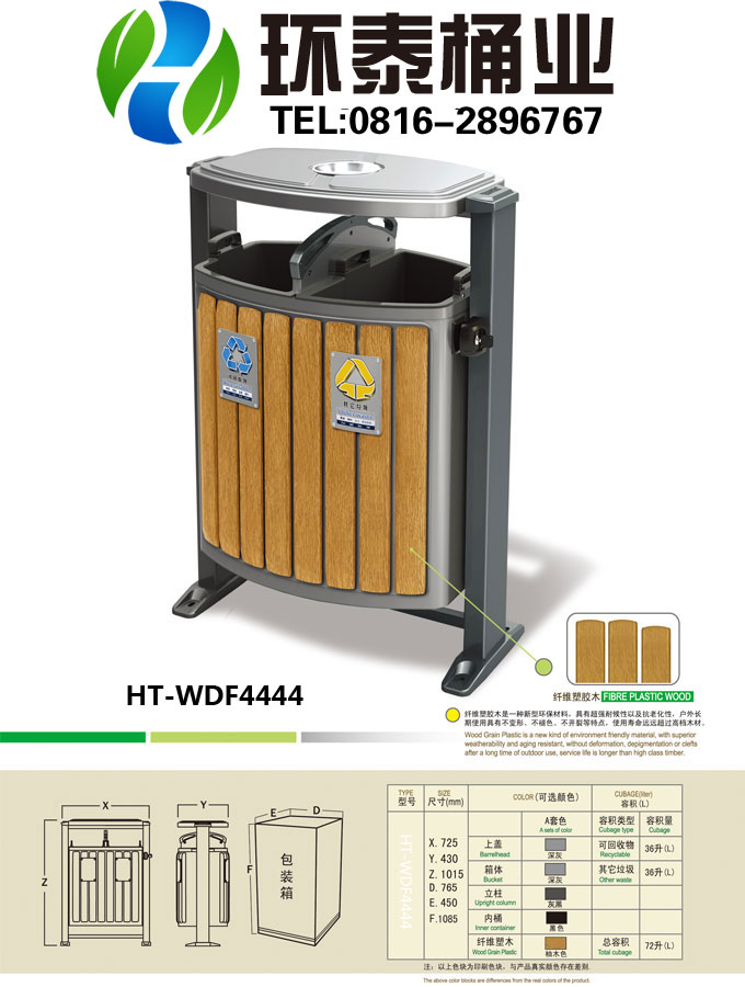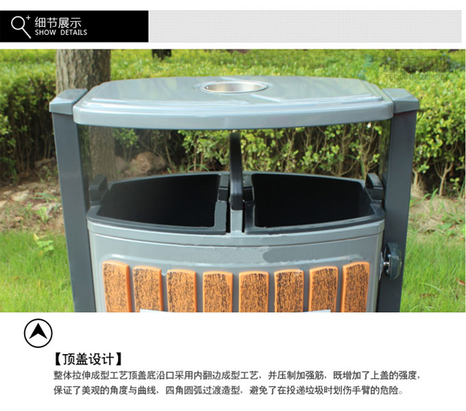 鋼木垃圾桶HT-WDF4444,該產(chǎn)品整體采用優(yōu)質(zhì)的電解溶鍍鋅板,防腐木生產(chǎn)加工而成,產(chǎn)品顏色為:深灰色+木條原色,規(guī)格為725*430*1015mm,本款德瀾仕電解分類(lèi)鋼木垃圾桶采用優(yōu)質(zhì)的電解溶鍍鋅板,整體拉伸工藝目前在鋼板成型類(lèi)產(chǎn)品的制造方面較為先進(jìn)的工藝為一次性拉伸成型工藝造型美觀,無(wú)焊接一次成型,從而避免了焊接點(diǎn)銹蝕,同時(shí)也具有較高的堅(jiān)固性,所以此工藝鋼板材料類(lèi)的首選工藝,表面處理:在金屬表面處理方面選擇靜電噴涂工藝,此工藝相比傳統(tǒng)的烤漆工藝,其特點(diǎn)表現(xiàn)為較高的戶外適應(yīng)性,表面涂層較為堅(jiān)固,不易脫落,抗紫外線以及耐候性強(qiáng).上蓋底沿口采用了內(nèi)翻邊成型工藝,搖擺中軸式旋轉(zhuǎn)機(jī)構(gòu)加配旋轉(zhuǎn)把手,清理更加方便,清理完畢后箱體自動(dòng)回位.木條采用纖維塑膠木具有超強(qiáng)耐候性及抗老化性,戶外長(zhǎng)期使用具有不變形、不褪色、不開(kāi)裂等特點(diǎn),使用壽命遠(yuǎn)遠(yuǎn)超過(guò)高檔木材。,HT-WDF4444鋼木垃圾桶也可按照您的具體需求可定制尺寸和顏色,可印制LOGO及文字,詳見(jiàn)說(shuō)明或咨詢客服.環(huán)泰愿為環(huán)保護(hù)航,一切為您,放心采購(gòu)。