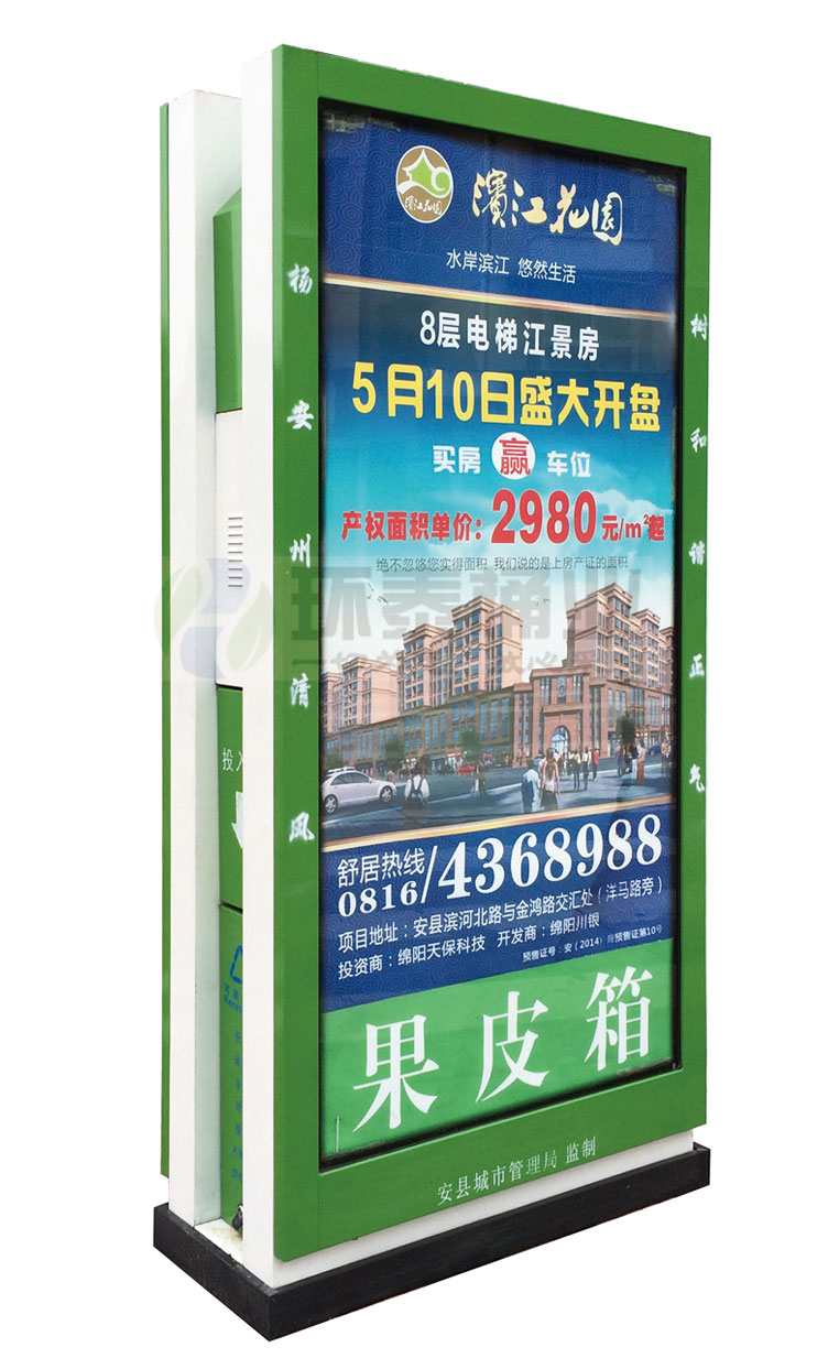 廣告垃圾箱位置優(yōu)勢明顯,廣告沖擊力強城市的垃圾桶都是設(shè)置在比較明顯的位置,無論是在什么地方你都能很容易的發(fā)現(xiàn)它.而且城市百姓每天都會同它接觸.在上面的廣告畫面會不時的閃見你的腦海給你強烈的廣告沖擊.這種每時每刻在不同的地方都能見到.
