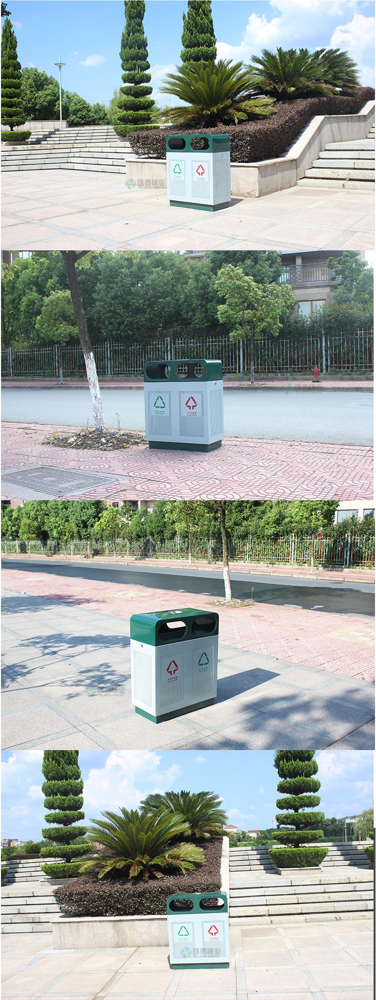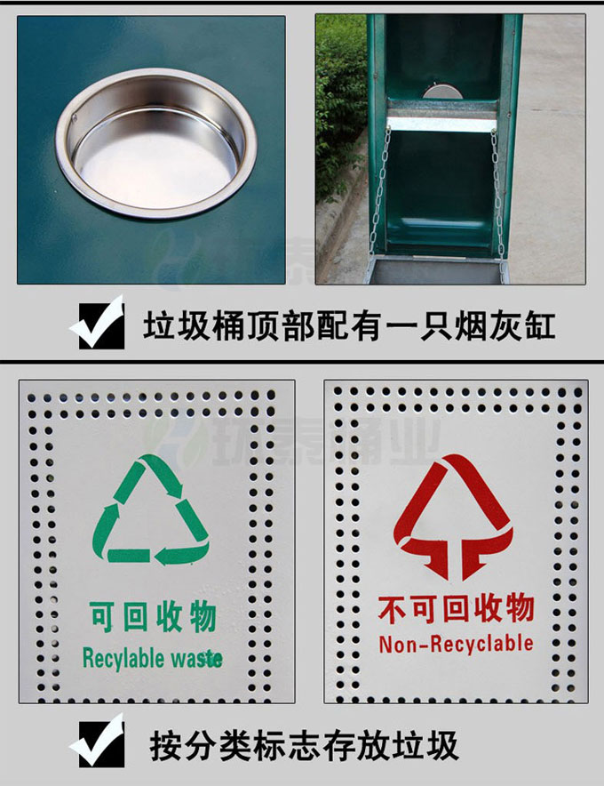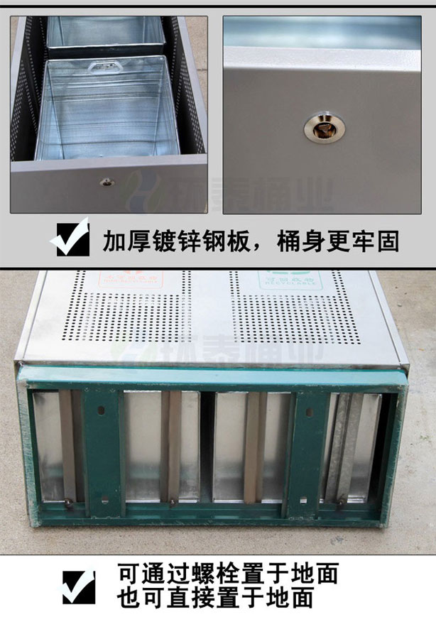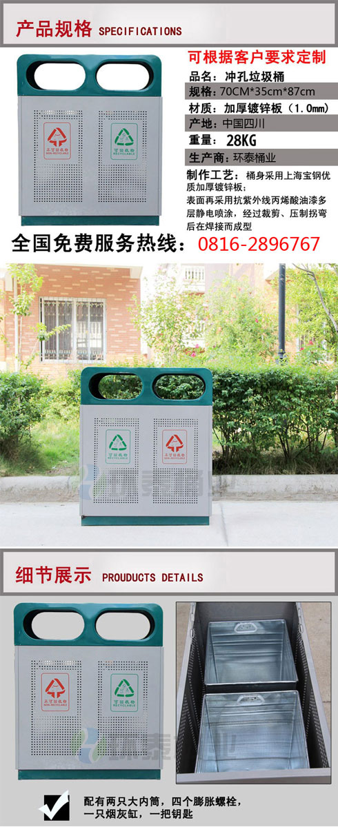 鋼制垃圾桶HT-GZ1701A,該產(chǎn)品整體采用優(yōu)質(zhì)的鍍鋅鋼板生產(chǎn)加工而成,產(chǎn)品顏色為:綠,白,規(guī)格為長700mm寬350mm高870mm,本款戶外沖孔式鋼制垃圾桶整體采用優(yōu)質(zhì)鍍鋅板,經(jīng)折彎沖壓一次性成型.產(chǎn)品一律用室外粉靜電噴塑,經(jīng)過180°的高溫,限度延長了垃圾桶的使用壽命,使垃圾桶顏色持久不變,亮麗如新.表面經(jīng)除油——清洗——酸洗——清洗——表調(diào)——磷化——清洗——烘干——靜電粉末噴涂——高溫塑化——冷卻.噴涂粉末經(jīng)ISO9002質(zhì)量體系認(rèn)證,易保潔表面光滑之優(yōu)點(diǎn),不脫落,不起層。,HT-GZ1701A鋼制垃圾桶也可按照您的具體需求可定制尺寸和顏色,詳見說明或咨詢客服.環(huán)泰愿為環(huán)保護(hù)航,一切為您,放心采購。