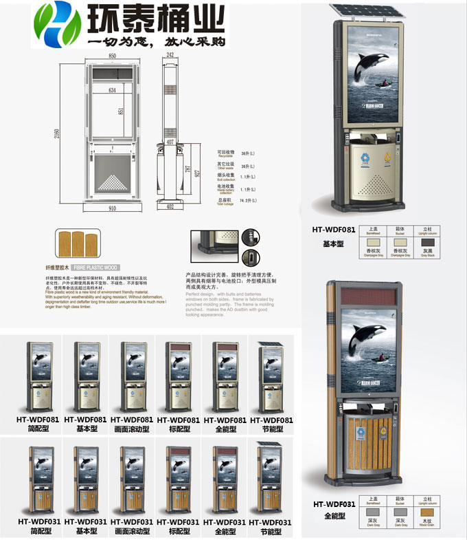 鋼制垃圾桶HT-WDF081,該產(chǎn)品整體采用優(yōu)質(zhì)的電解溶鍍鋅板生產(chǎn)加工而成,產(chǎn)品顏色為:白色,規(guī)格為長(zhǎng)900mm寬407mm高2160mm,本款景區(qū)分類廣告垃圾桶,HT-WDF081鋼制垃圾桶也可按照您的具體需求僅定制顏色,可印制LOGO及文字,詳見說(shuō)明或咨詢客服.環(huán)泰愿為環(huán)保護(hù)航,一切為您,放心采購(gòu)。