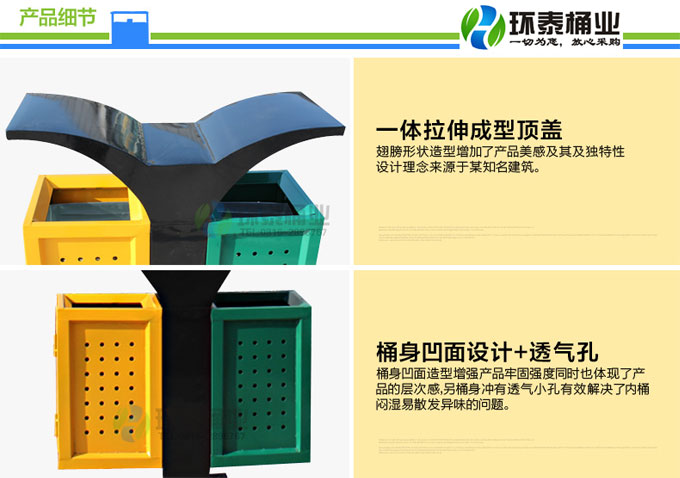 鋼制垃圾桶HT-GZ7900,該產(chǎn)品整體采用優(yōu)質(zhì)的鍍鋅鋼板生產(chǎn)加工而成,產(chǎn)品顏色為:黑色+黃色+淺綠,規(guī)格為長900mm寬350mm高980mm,本款翼型鋼制垃圾桶整體采用優(yōu)質(zhì)鍍鋅板,經(jīng)折彎沖壓一次性成型.產(chǎn)品一律用室外粉靜電噴塑,經(jīng)過180°的高溫,限度延長了垃圾桶的使用壽命,使垃圾桶顏色持久不變,亮麗如新.表面經(jīng)除油——清洗——酸洗——清洗——表調(diào)——磷化——清洗——烘干——靜電粉末噴涂——高溫塑化——冷卻.噴涂粉末經(jīng)ISO9002質(zhì)量體系認證,易保潔表面光滑之優(yōu)點,不脫落,不起層。,HT-GZ7900鋼制垃圾桶也可按照您的具體需求僅定制顏色,可印制LOGO及文字,詳見說明或咨詢客服.環(huán)泰愿為環(huán)保護航,一切為您,放心采購。