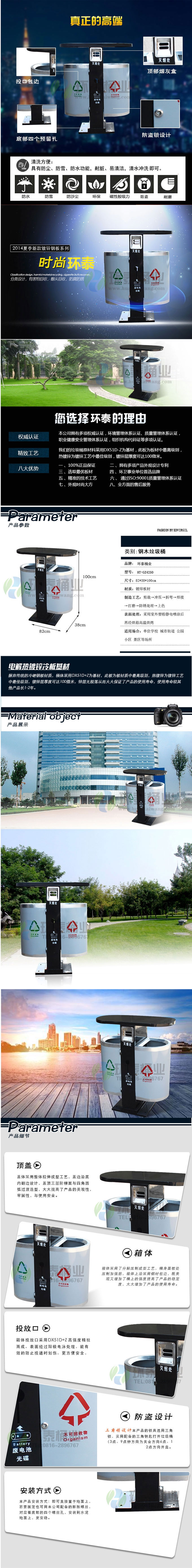 鋼制垃圾桶HT-GZ4520,該產(chǎn)品整體采用優(yōu)質(zhì)的冷軋鋼板,鍍鋅鋼板生產(chǎn)加工而成,產(chǎn)品顏色為:黑/灰色,規(guī)格為長820mm寬380mm高1000mm,本款圓形戶外鋼制分類果皮箱整體采用優(yōu)質(zhì)冷軋鋼板,經(jīng)折彎沖壓一次性成型.產(chǎn)品一律用室外粉靜電噴塑,經(jīng)過180°的高溫,限度延長了垃圾桶的使用壽命,使垃圾桶顏色持久不變,亮麗如新.表面經(jīng)除油——清洗——酸洗——清洗——表調(diào)——磷化——清洗——烘干——靜電粉末噴涂——高溫塑化——冷卻.噴涂粉末經(jīng)ISO9002質(zhì)量體系認證,易保潔表面光滑之優(yōu)點,不脫落,不起層,HT-GZ4520鋼制垃圾桶也可按照您的具體需求可定制尺寸和顏色,可印制LOGO及文字,詳見說明或咨詢客服.環(huán)泰愿為環(huán)保護航,一切為您,放心采購。