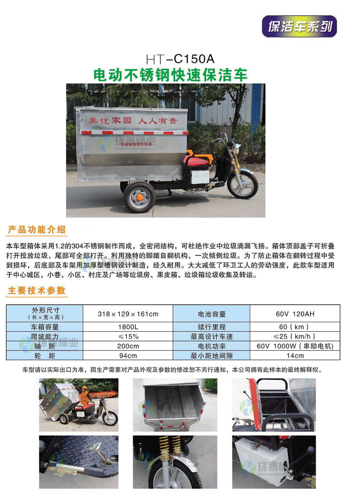 環(huán)衛(wèi)垃圾車HT-C150A,該產(chǎn)品整體采用優(yōu)質(zhì)的不銹鋼鋼板生產(chǎn)加工而成,產(chǎn)品顏色為:銀色,規(guī)格為長(zhǎng)3180mm寬1290mm高1610mm,本款電動(dòng)不銹鋼快速保潔車本車型箱體采用1.2的304不銹鋼制作而成,全密閉結(jié)構(gòu),箱蓋設(shè)有蓋中蓋,可杜絕作業(yè)中的垃圾地漏飄散,箱體頂部蓋子可折疊打開(kāi)投放垃圾,尾部可全部打開(kāi),利用獨(dú)特的腳踏自翻機(jī)構(gòu),一次傾倒垃圾,為了保護(hù)箱體在翻轉(zhuǎn)中不受損傷,箱體后底部設(shè)有保險(xiǎn)杠和防撞梁,箱體與座包間設(shè)有超大儲(chǔ)物箱,整車體積小,適于在小區(qū),廣場(chǎng),廠區(qū),小巷,人行道等路段垃圾收集和巡回保潔使用,此車既可以電動(dòng)行駛又可以腳蹬行駛,隨走隨停,方便靈活,僅需一個(gè)人即可作業(yè),大大節(jié)省了人工,提升了工作效率,HT-C150A環(huán)衛(wèi)垃圾車也可按照您的具體需求,詳見(jiàn)說(shuō)明或咨詢客服.環(huán)泰愿為環(huán)保護(hù)航,一切為您,放心采購(gòu)。