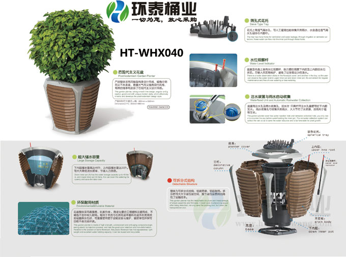 花盆/花箱HT-WHX040,該產(chǎn)品整體采用優(yōu)質(zhì)的高密度聚乙烯(HDPE),塑料生產(chǎn)加工而成,產(chǎn)品顏色為:原木色,規(guī)格為,本款新款主義花盆,HT-WHX040花盆/花箱也可按照您的具體需求可印制LOGO及文字,詳見說明或咨詢客服.環(huán)泰愿為環(huán)保護航,一切為您,放心采購。