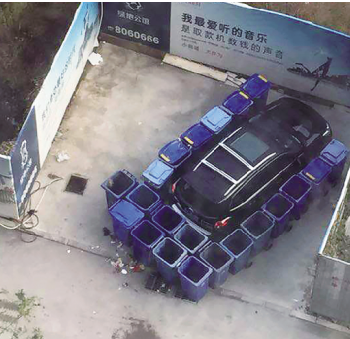 網(wǎng)友發(fā)帖:越野車遭垃圾桶“圍困”