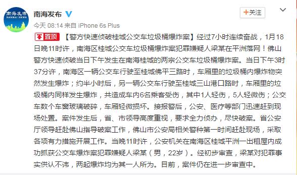 據(jù)廣東省佛山市南海區(qū)人民政府新聞辦公室官方微博通報,經(jīng)過7小時連續(xù)奮戰(zhàn),1月18日晚11時許,南海區(qū)桂城公交車垃圾桶爆炸案犯罪嫌疑人梁某在平洲落網(wǎng)。佛山警方快速偵破當日下午發(fā)生在南海桂城的兩宗公交車垃圾桶爆炸案。