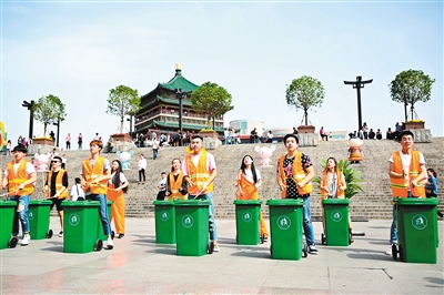 昨日15時(shí),鐘樓金花廣場(chǎng)行人如織。突然,10個(gè)綠色的垃圾桶被人搬進(jìn)了廣場(chǎng)。10名身穿黃色保潔衣服的青年男女,用木棍在垃圾桶上敲打起來(lái),奏響了美妙的樂(lè)章。原來(lái)是共青團(tuán)陜西省委聯(lián)合西安音樂(lè)學(xué)院團(tuán)委,在西安市鐘樓金花廣場(chǎng)為全省廣大青年們送出了一份特別的禮物—— “快閃”秀,以這種青年人的方式慶祝五四青年節(jié)。