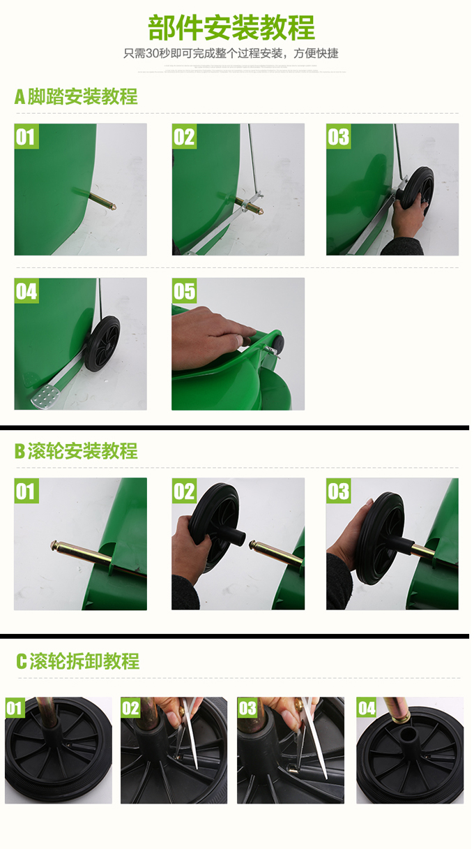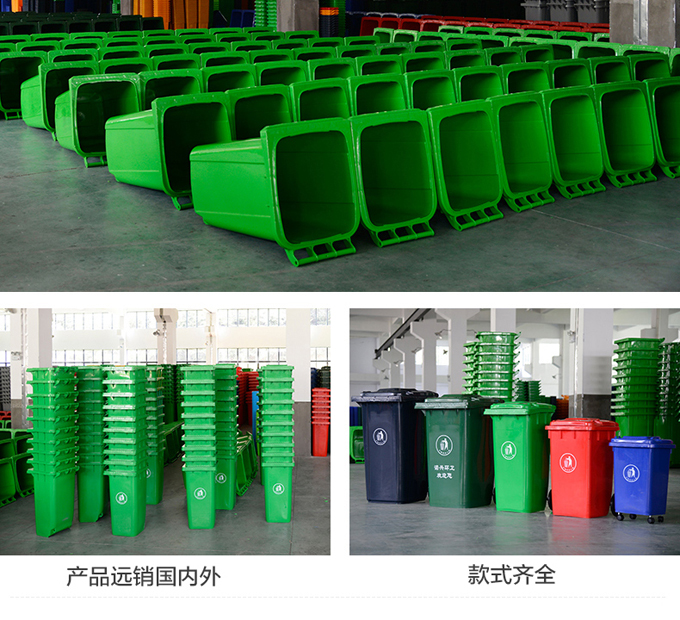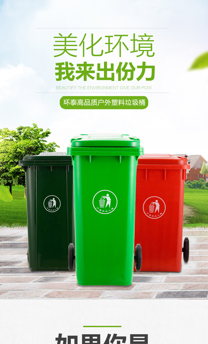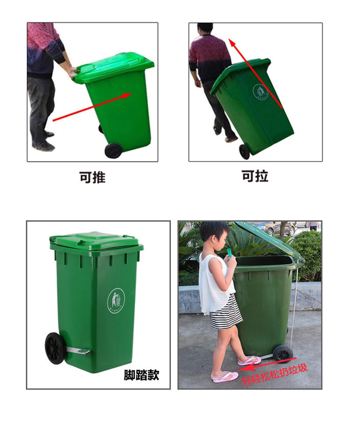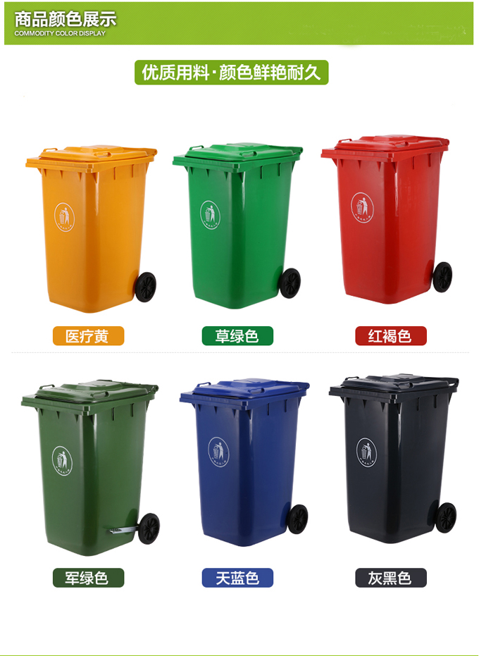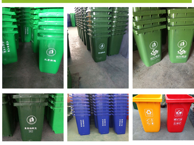 提供各種顏色(藍(lán)、紅、黃、綠、黑)的塑料垃圾桶供您選擇; 容易清洗,擦洗后塑料垃圾桶仍光潔如新:塑料垃圾箱采用獨(dú)特的外形設(shè)計(jì),外表美觀、大方。 塑料垃圾桶蓋可防垃圾氣味散發(fā),更可防止蚊蟲、蒼蠅滋生,更衛(wèi)生; 體積大、尖利、骯臟的垃圾/物件可隨流動(dòng)塑料垃圾桶一起運(yùn)走,更方便、更安全。廣泛適用于各類公共場(chǎng)所(小區(qū)、寫字樓、學(xué)校、市政、工廠、物業(yè)等)。