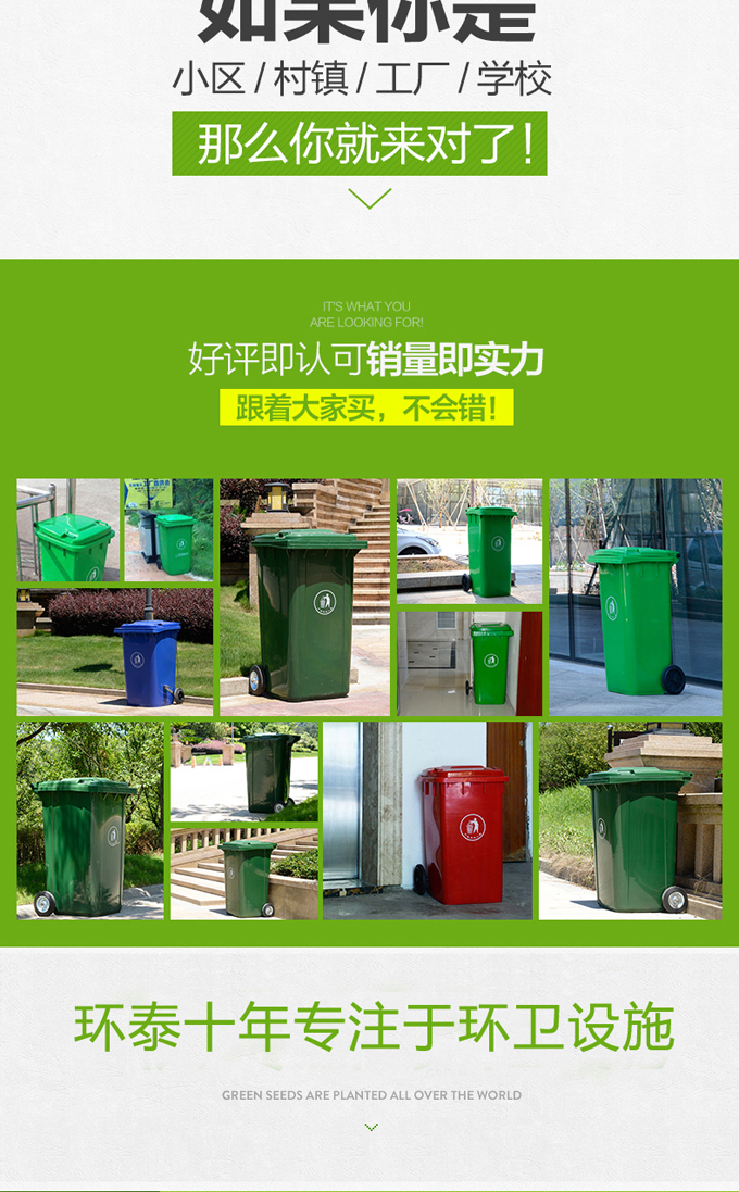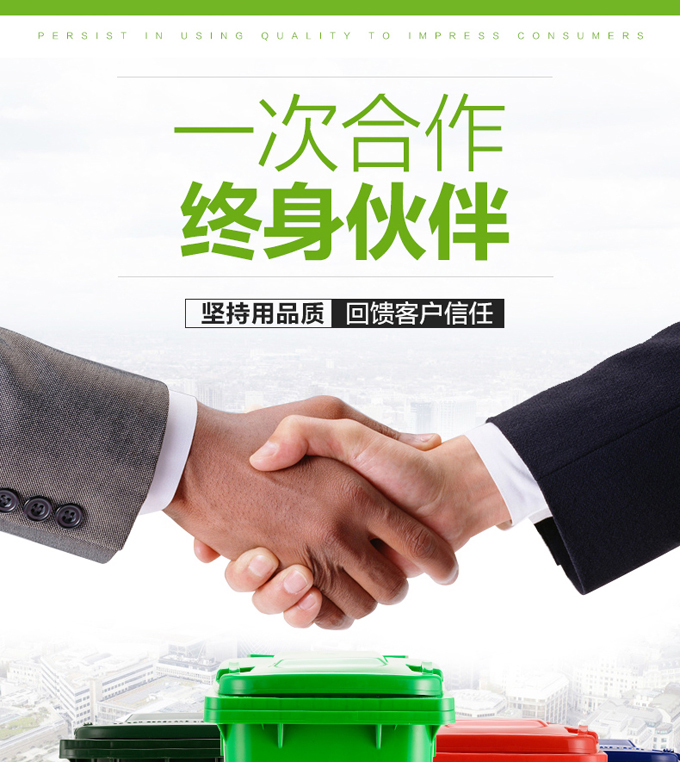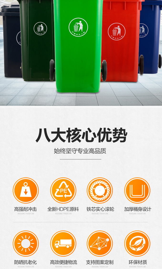 塑料垃圾桶HT-SL240M,該產(chǎn)品整體采用優(yōu)質(zhì)的高密度聚乙烯(HDPE)生產(chǎn)加工而成,產(chǎn)品顏色為:可選-藍(lán)色、綠色、灰色、紅色、黃色,規(guī)格為長(zhǎng)730mm寬590mm高1010mm,本款240L塑料垃圾桶(多色)采用工程塑料制造,100%的高密度聚乙烯或者是聚丙烯為原材料經(jīng)過(guò)嚴(yán)格的科學(xué)的注模工藝精制而成.針對(duì)目前市場(chǎng)上使用的產(chǎn)品情況和經(jīng)常出現(xiàn)的問(wèn)題在塑料垃圾桶底部上沿口都做了加強(qiáng)處理,在桶身的壁厚上采用非等厚設(shè)計(jì)原理,把薄弱環(huán)節(jié)加厚,所用輪子采用高承載力耐磨靜音輪,使用壽命超長(zhǎng),HT-SL240M塑料垃圾桶也可按照您的具體需求僅定制顏色,可印制LOGO及文字,詳見說(shuō)明或咨詢客服.環(huán)泰愿為環(huán)保護(hù)航,一切為您,放心采購(gòu)。